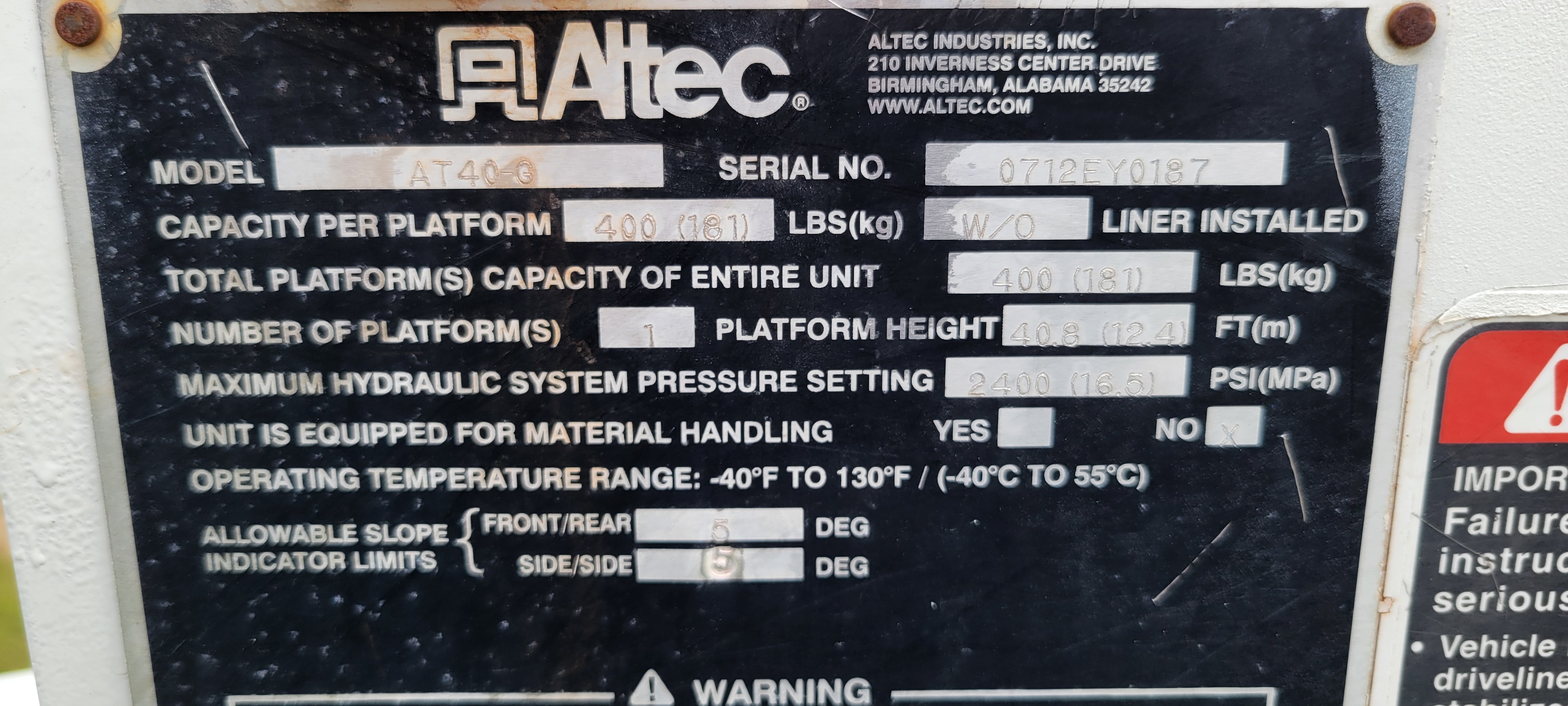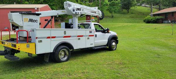2012 Ford F550 truck mounted with a 2012 Altec AT40G insulated bucket. This well-maintained unit features a new Ford remanufactured 6.7L Power Stroke engine with only 8,500 miles, still under warranty until November 2025. The truck is equipped with new Hankook tires and a backup camera, offering both reliability and safety. The Altec AT40G boom has 4,506 hours, a 45-foot working height, continuous rotation, and a bucket rotator—everything operates as it should. $61,000 OBO