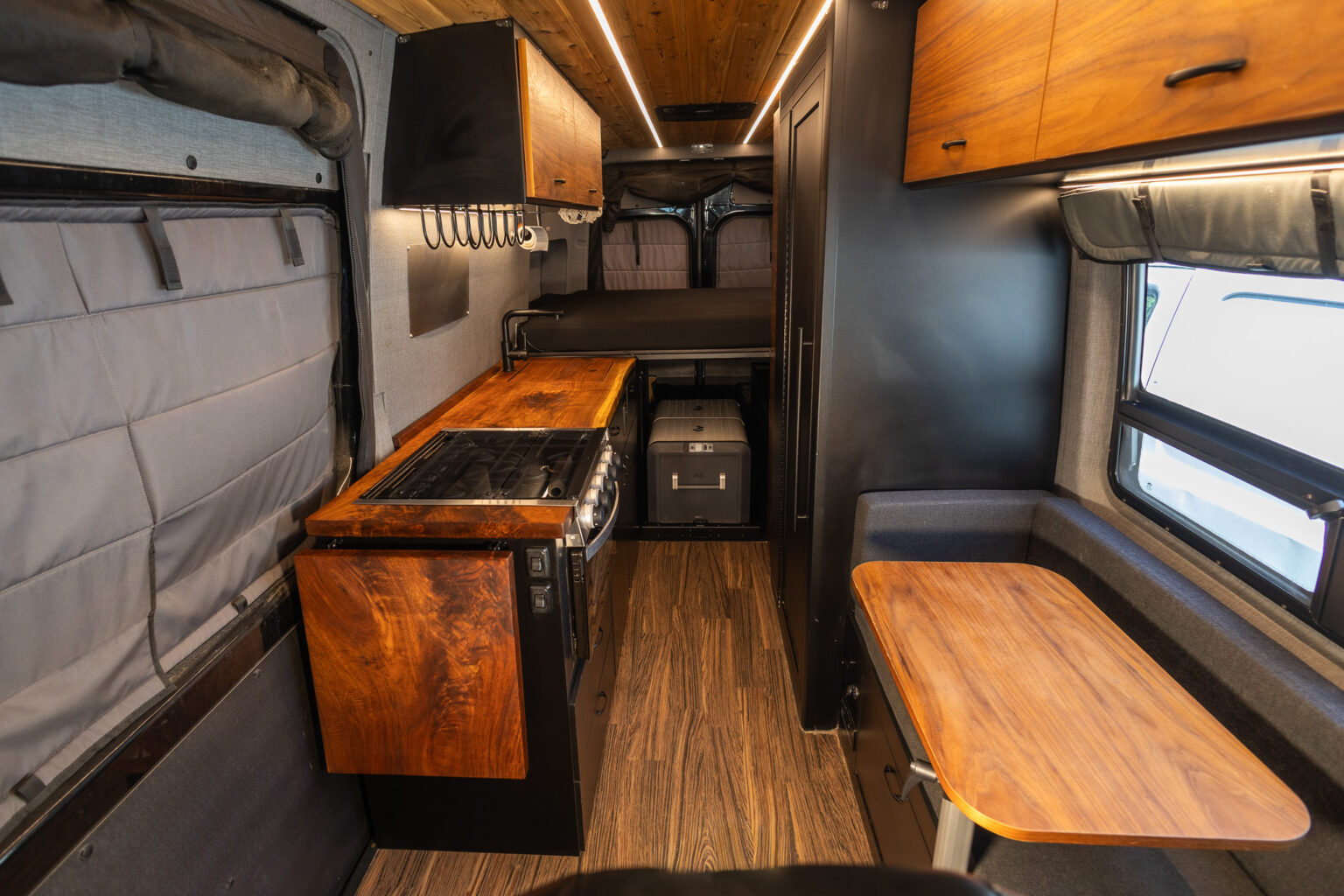 The galley includes a butcher block countertop, sink with hot/cold water, stovetop/oven combo, and overhead cabinetry, while additional seating is provided by a spacious a bench with Lagun table. Entertainment comes from an articulating mount TV, while safety features include a fire extinguisher, smoke detector, and CO2 alarm.