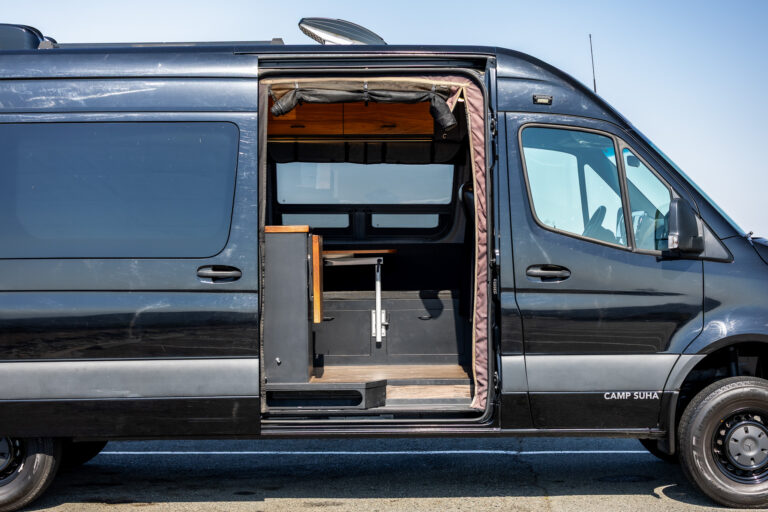 For sale is a 2021 Mercedes-Benz Sprinter 170 4×4 adventure van, professionally built by Camp Suha in Carlsbad with only 12,421 miles. With its open floorplan this rig is fully outfitted for off-grid travel, combining luxury finishes with serious capability. The van features a premium insulation package (Reflectix, Havelock wool, Kilmat soundproofing), cedar plank ceiling, marine vinyl upholstered walls, and Lonseal vinyl flooring. Extended painted flares with CRL cutouts create more sleeping space, complemented by a full-time bed with custom upholstery and magnetic window coverings.