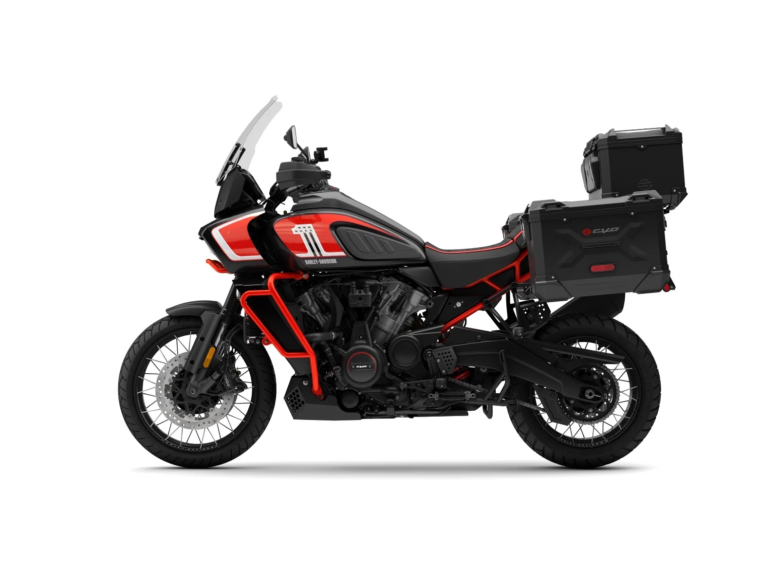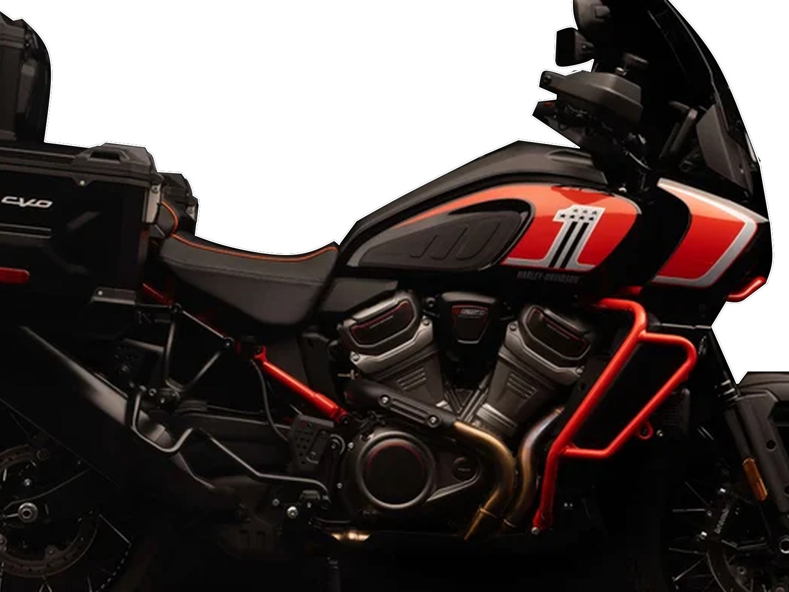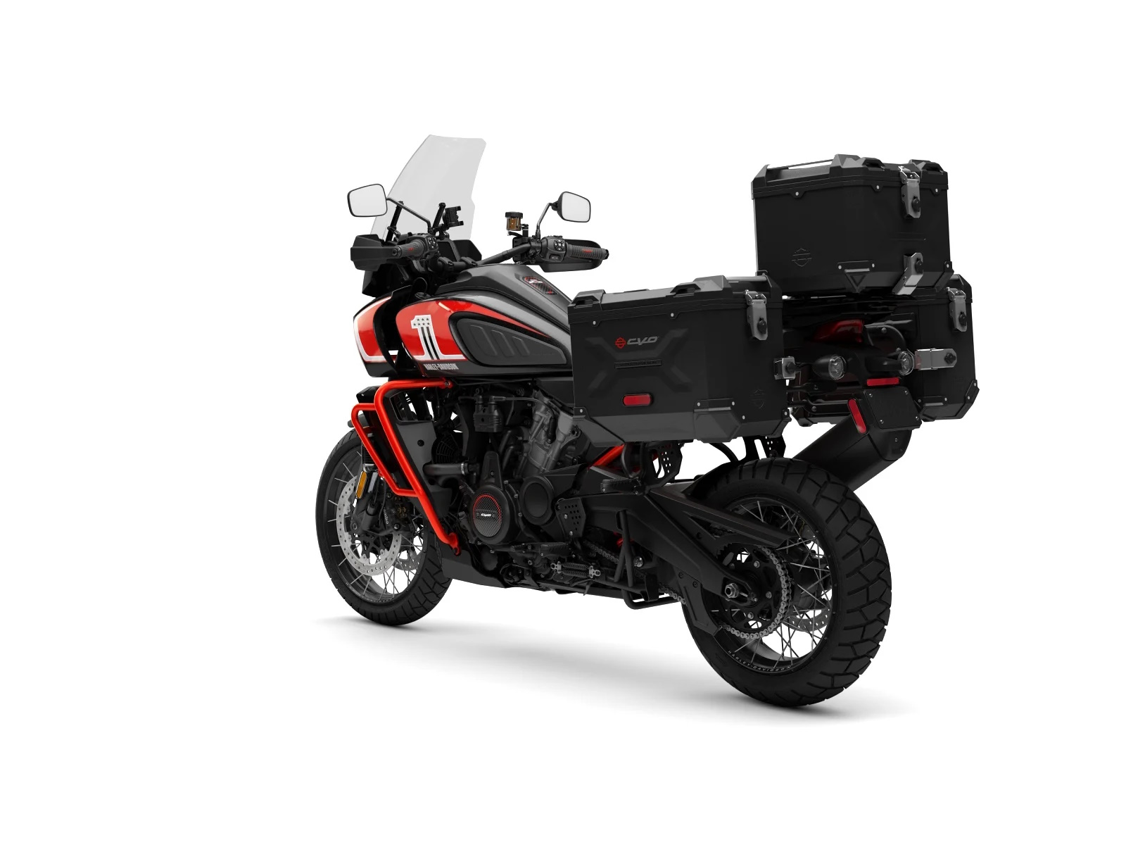 - The CVO Pan America stands out in Legendary Orange with Raven Metallic and Atlas Silver on the fuel tank and fairing. A stylized “#1” logo adorns the fuel tank, and a small CVO graphic lives on each case side. CVO 25th Anniversary graphics are on top of the outer fairing and the console insert.